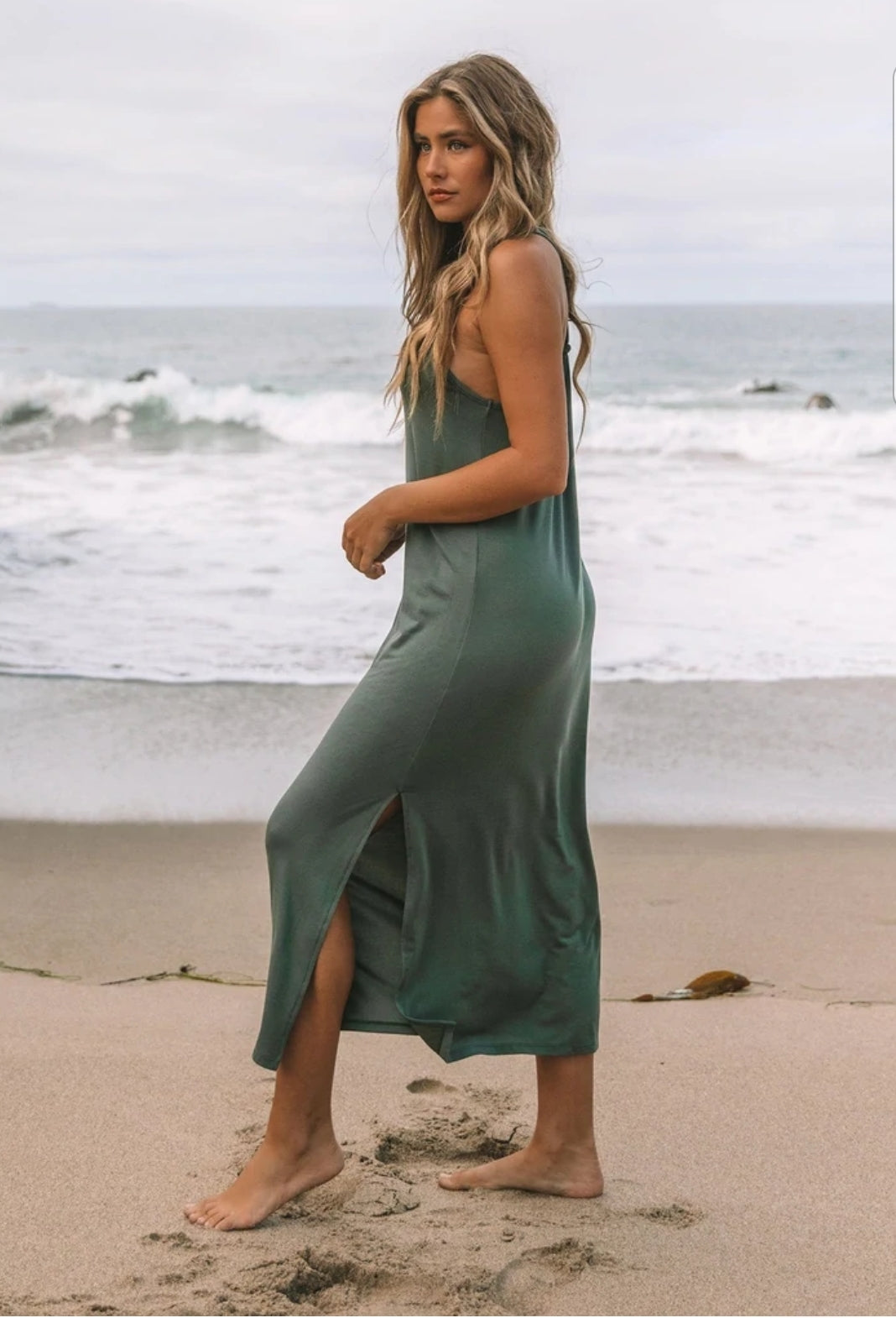 This maxi dress is simple and sexy! Ultra-soft with the right amount of stretch for the perfect fit! Featuring a side slit, round crewneck line, and a flirty knot racerback detail, we are sure you will love this dress as much as we do!